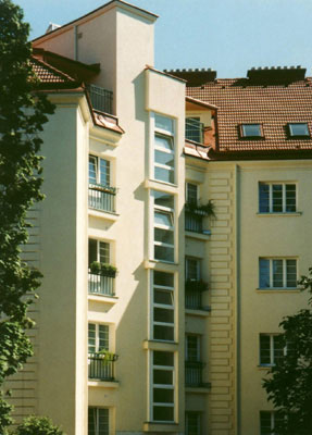 Eine architektonische Dominante dieses Baues sind Giebelformen, welche die horizontale Traufenlinie aufbrechen und ein lebendiges Erscheinungsbild bewirken. Unter Einbeziehung dieser Vorgaben in die Gestaltung des Dachgeschoßausbaues entstanden großzügige Fensterbänder und raumhohe Verglasungen zwischen den Giebeln. Beiderseits der Aufzugszubauten entstanden Loggien und Terrassen. Die Wohnräume erhielten dadurch die Vorzüge einer modernen Dachwohnung mit Blickbezügen zu den Grünräumen im Hof.